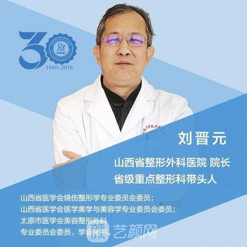 刘晋元:副主任医师,省级重点整形学科带头人,现任山西省整形外科医院院长。从事整形美容一线工作近30年,多次到韩国、日本等国内外整形医院进修学习,在各级专业杂志发表及国内学术会议交流的论文近二十篇。刘院长还多次和中、日、韩多位整形医生同台手术,被誉为“山西医美整形名刀”。评价双眼皮手术细腻,追求自然、逼真,以精细见长。